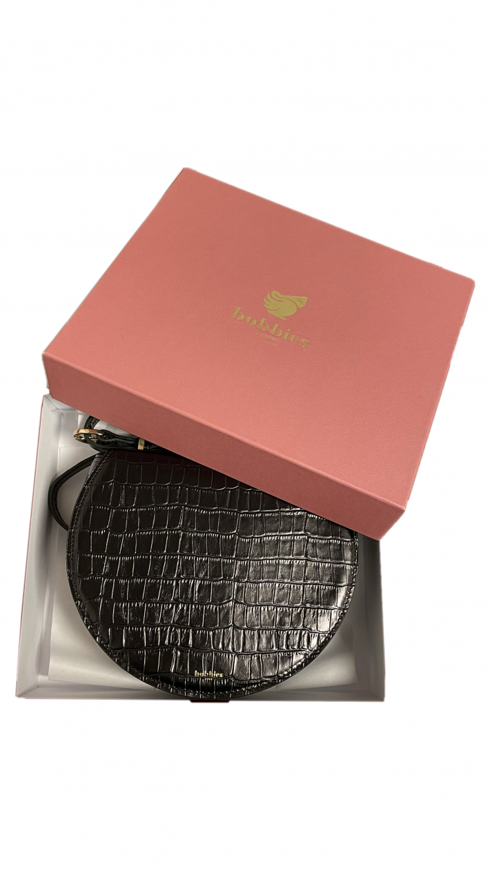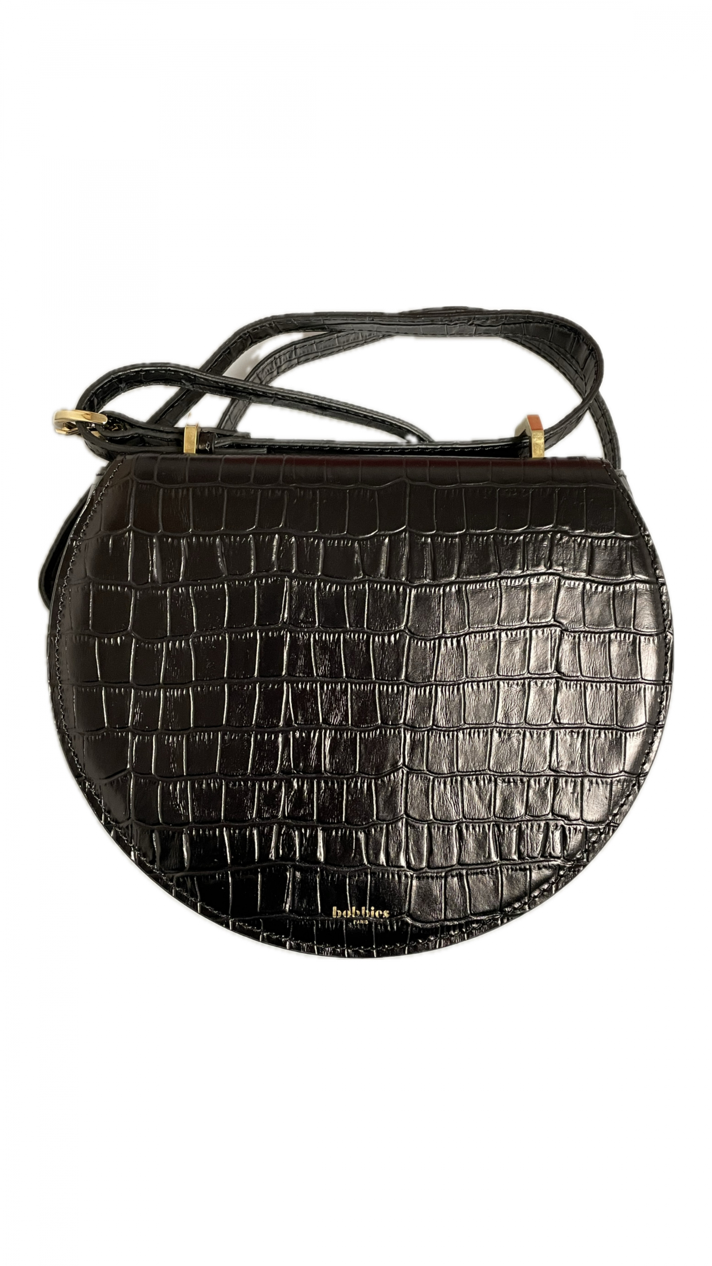 Sac en cuir de la marque Bobbies, état neuf. Il s'agit d'un sac couleur noir féroce en cuir, embossé croco.