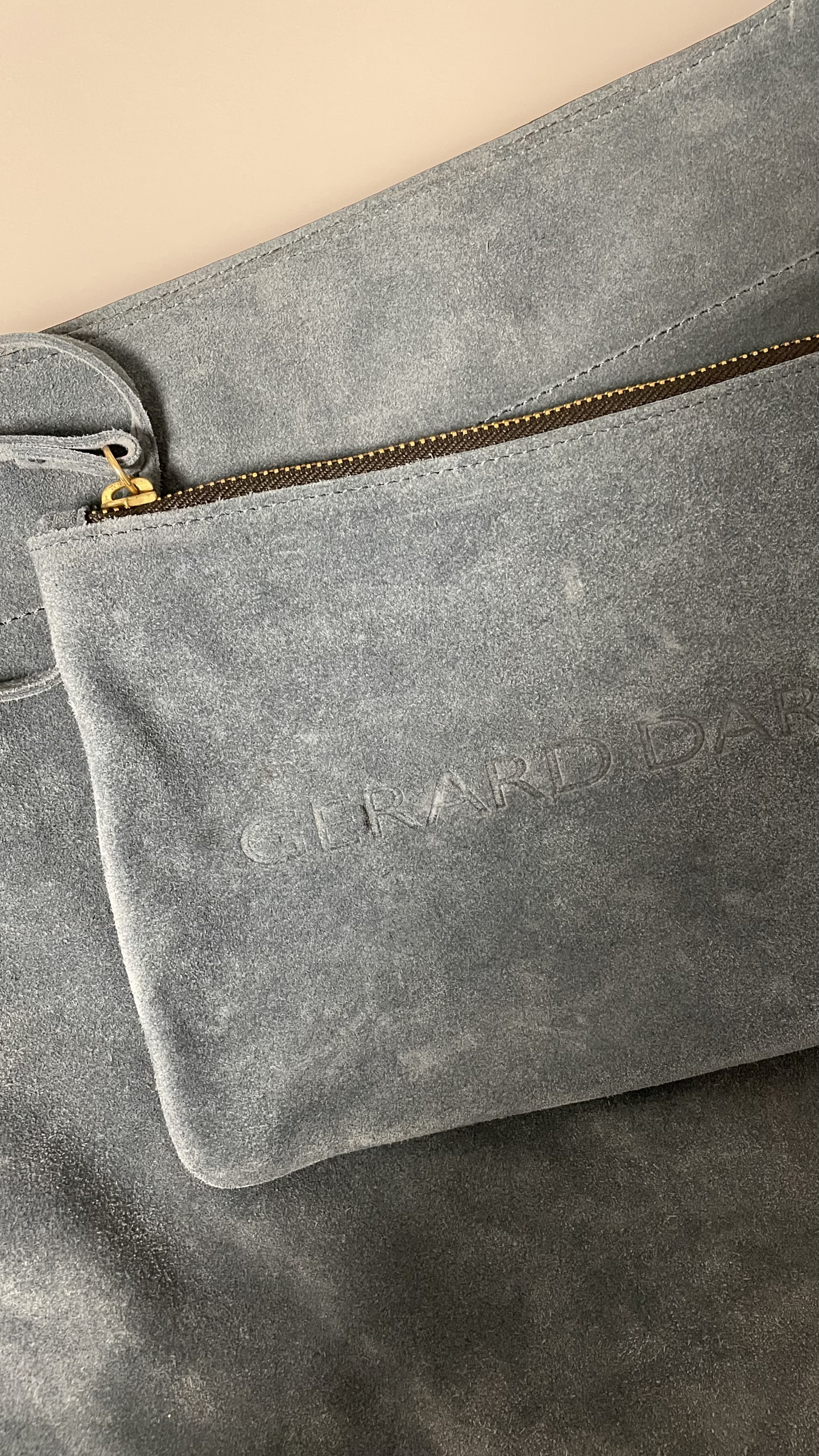 Il s'agit d'un sac neuf de la marque Gérard Darel. Le sac est en daim et est bleu délavé. On retrouve dans le sac une petite pochette de la même matière et de la même couleur. La anse permet un sac porté épaule.