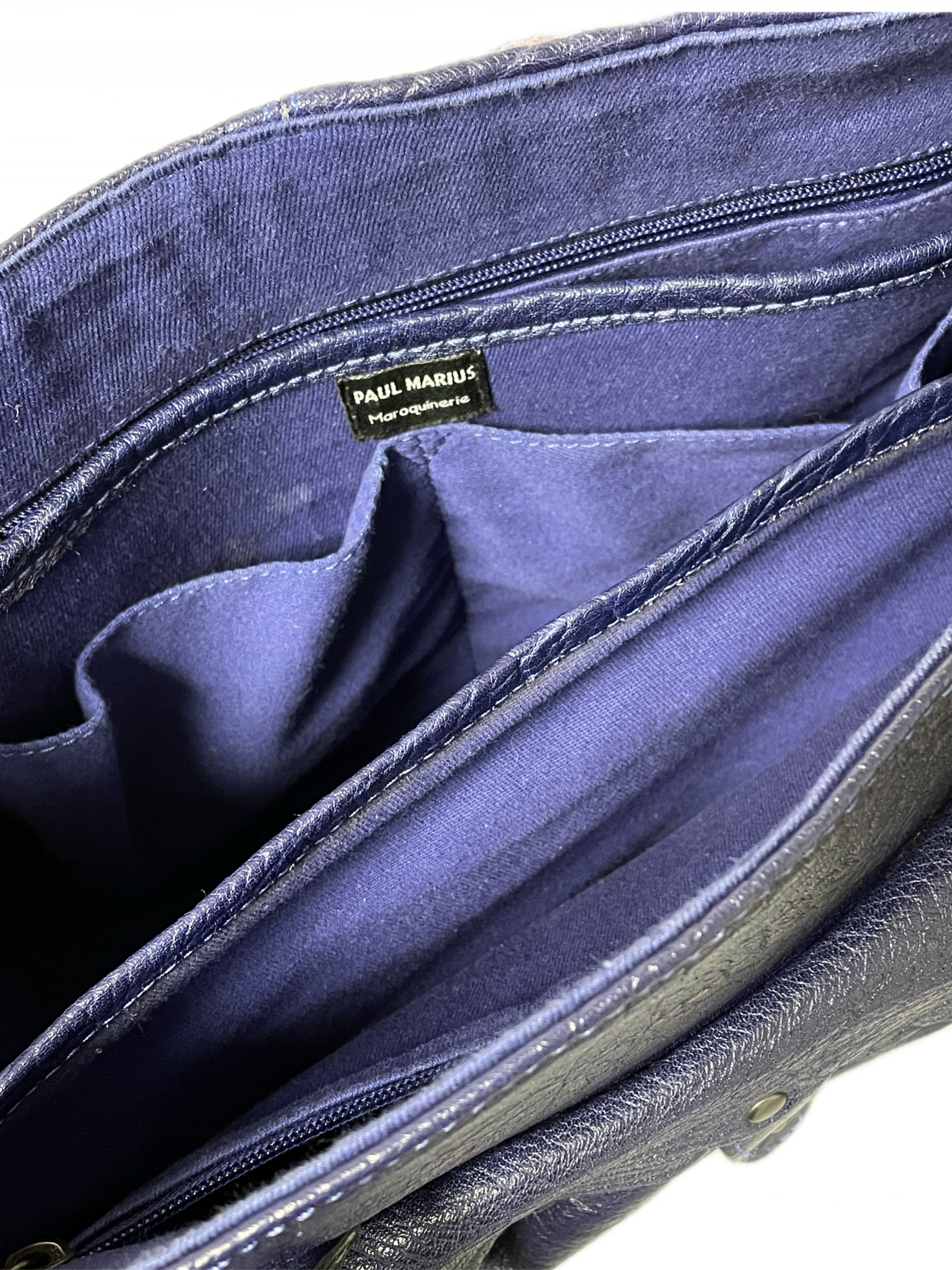 Il s’agit d’un sac de la marque Paul Marius. Ce sac est en cuir bleu foncé avec un aspect texturé. Ce modèle est équipé de d'une poignée pour un porté main et d’une bandoulière permettant un porté épaule ou croisé.